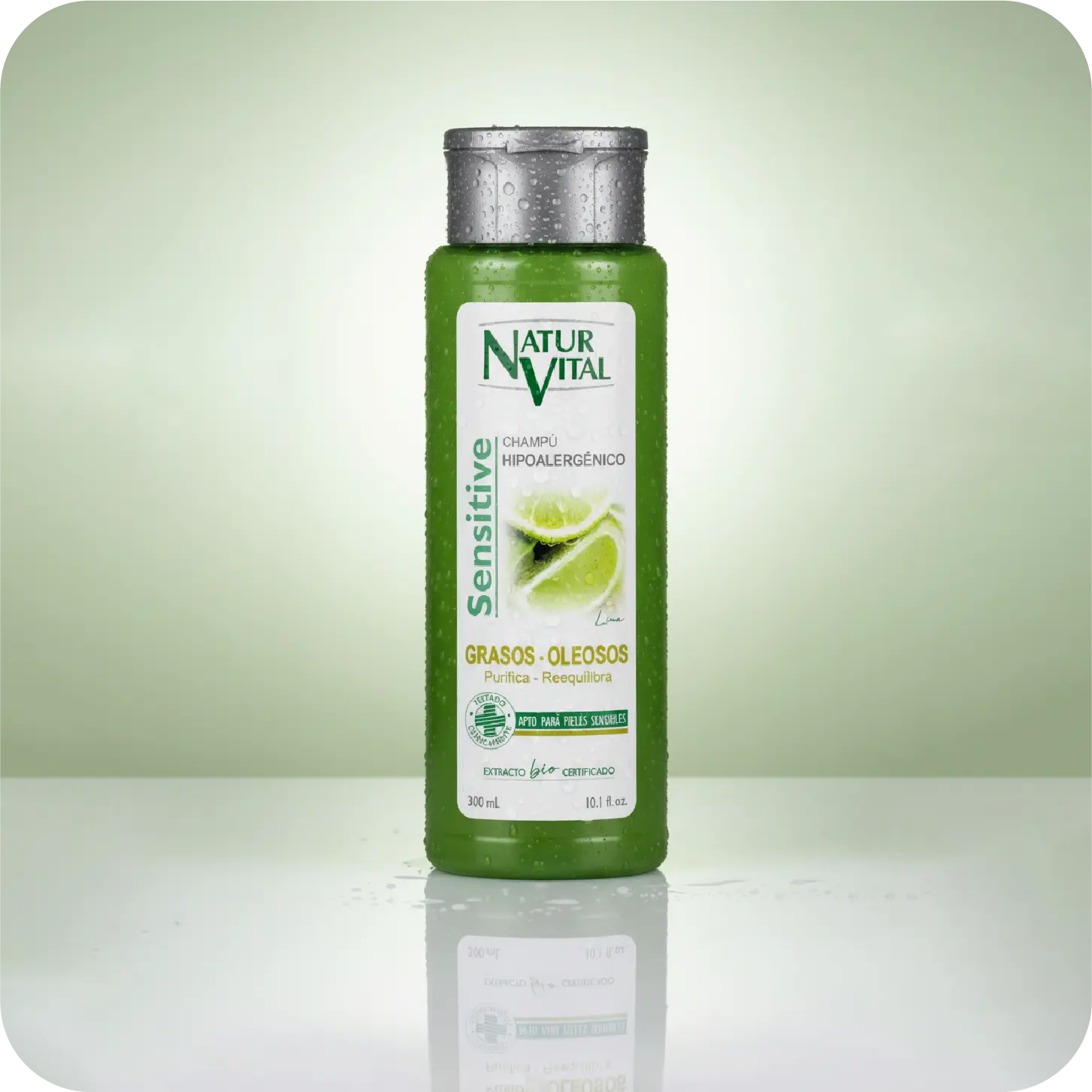 Champú hipoalergénico con extracto natural de Lima, Hamamelis y Ortiga, para la limpieza y cuidado del cabello graso, reequilibra, purifica y tonifica el cuero cabelludo.
